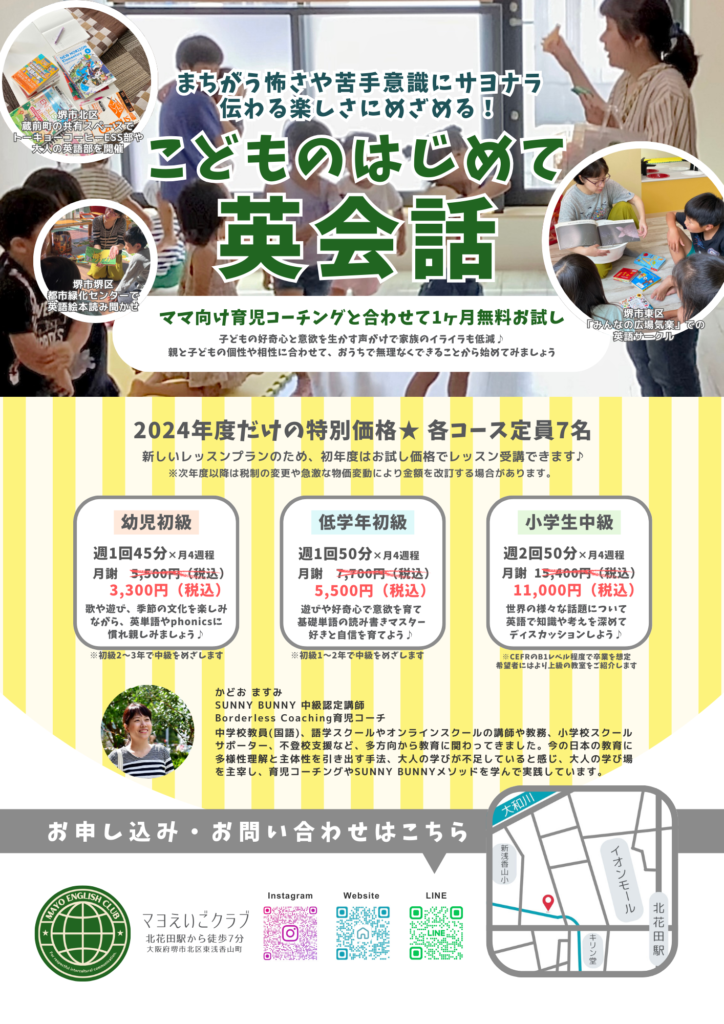 北花田教室は2024年9月にプレオープン予定です。小さなスペースで、週1回(中級は週2回)、少人数でスタートします。子ども同士が英語でおしゃべりをはじめる、SUNNY BUNNY (サニーバニー)メソッドを導入した新しいレッスンプランを使用するため初年度は特別価格。